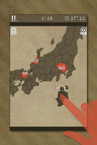 あそんでまなべる 旧国名パズルには国名表示や境界線表示の有無が異なる「トレーニング」「ベーシック」「エキスパート」モードが用意されていますが、よほどの歴史好きでない限りは県名と境界線がある「トレーニング」からプレイしてみることをおすすめします。スタートすると上半分に白地図、下にパズルのピースのようになった国々が表示されるので、タップで地図上に配置していきます。全ての白地図を埋めればクリアです。古い和紙のようなデザインも雰囲気を盛り上げます。